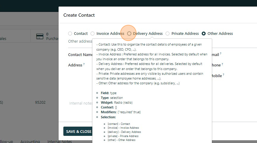 3. As you hover over the different types of contacts/addresses a brief explanation of each type of subsidiary is given. In this case we're adding a "delivery address"