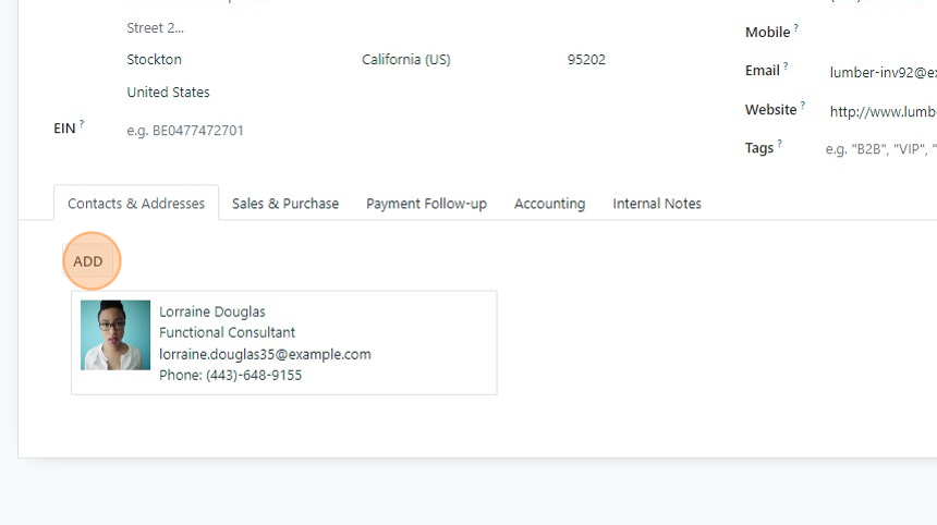 2. Under "Contacts and Addresses Tab" Click "ADD"
