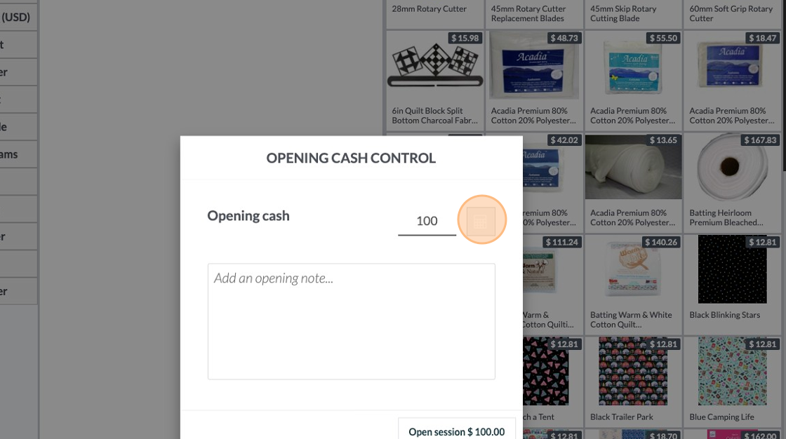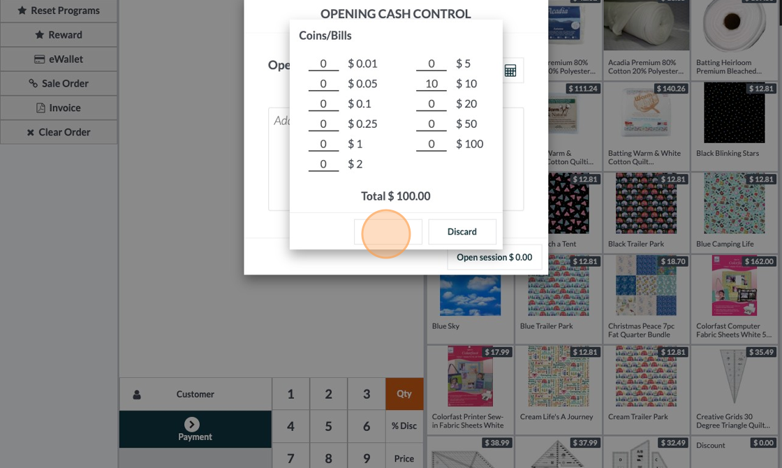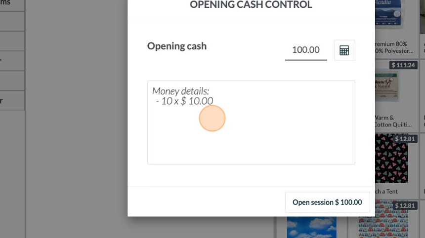 5. This is the opening control screen. From here you can click "Open Session" and the session will open and make an entry that there was $100 cash in the till. (Note: the amount of cash in the opening control is the amount left in the till from the previous session. This can be automatically configured in the POS settings.)