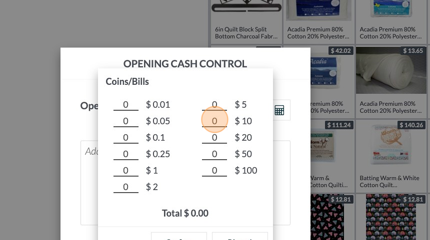 If you click the calculator button another pop-up appears with a cash/coin counter.