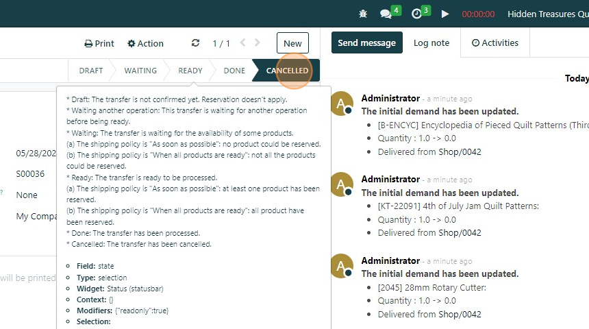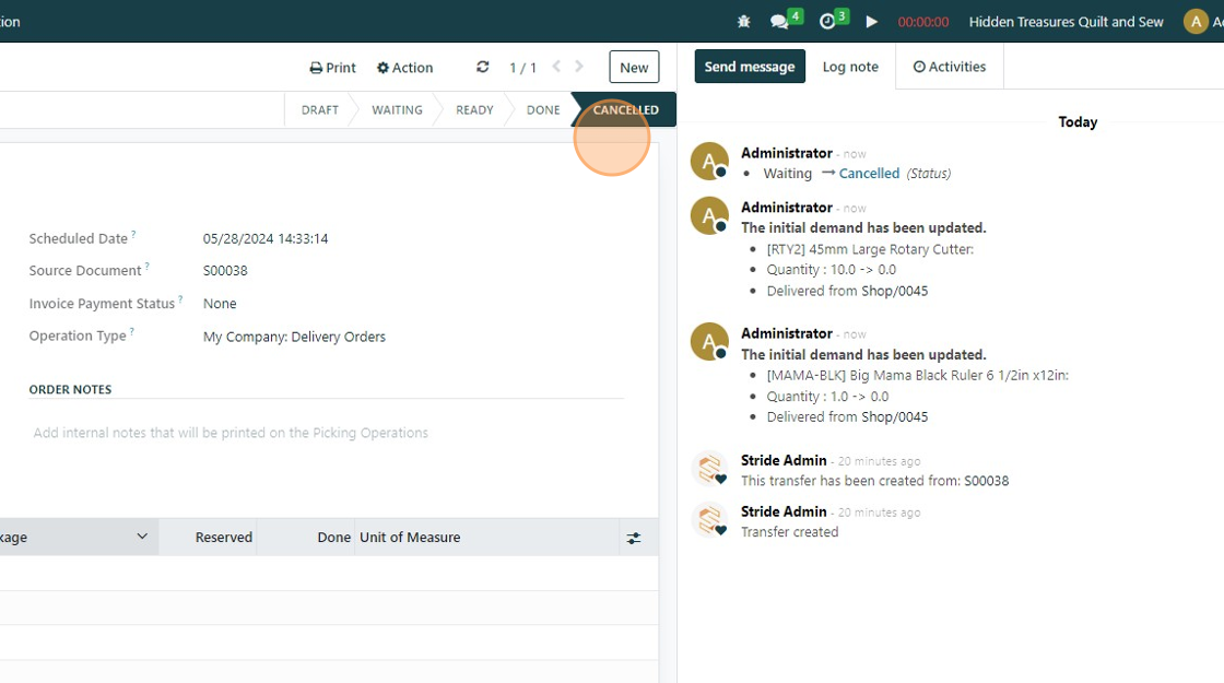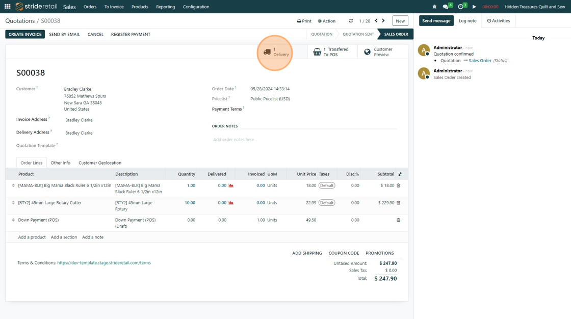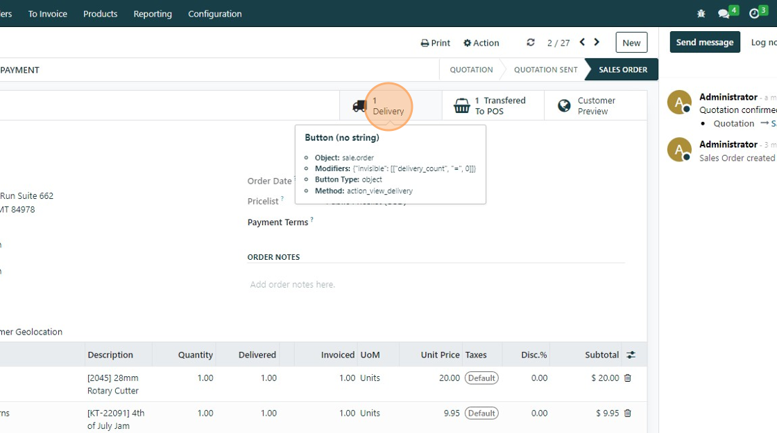 17. This order now has a tab that says "Transferred to POS" meaning it was settled in the POS. It still has a delivery order attached, but if you click "Delivery" you will see the Delivery order has been cancelled.