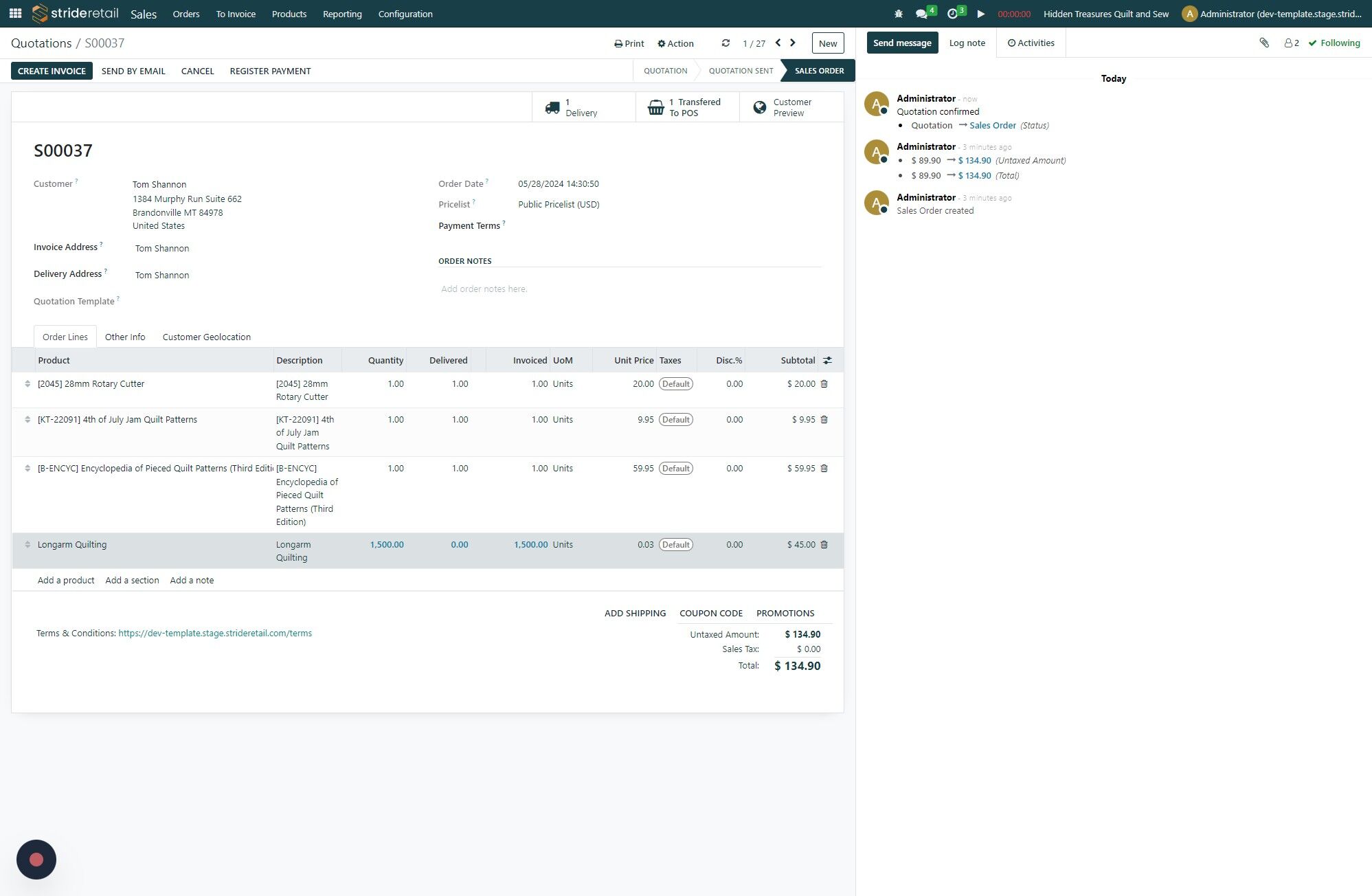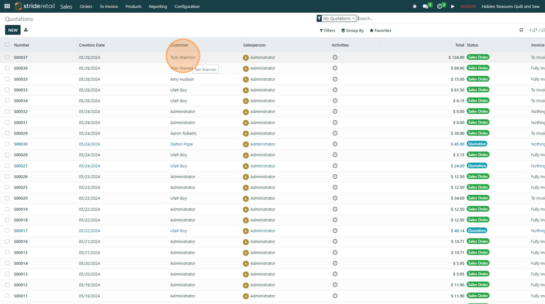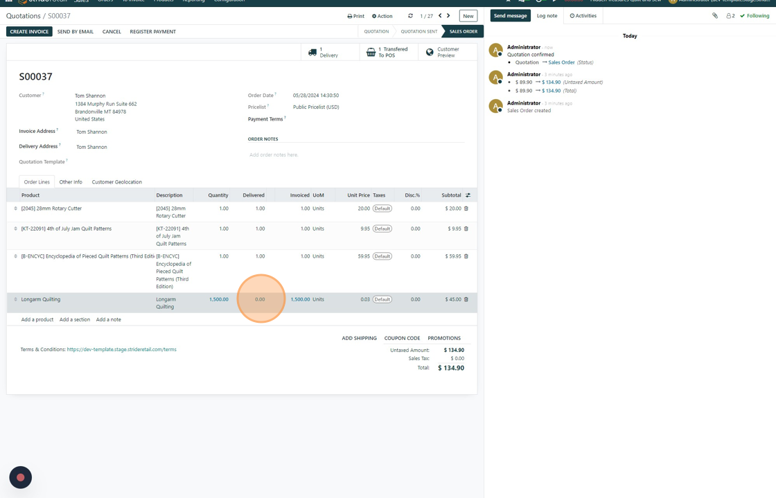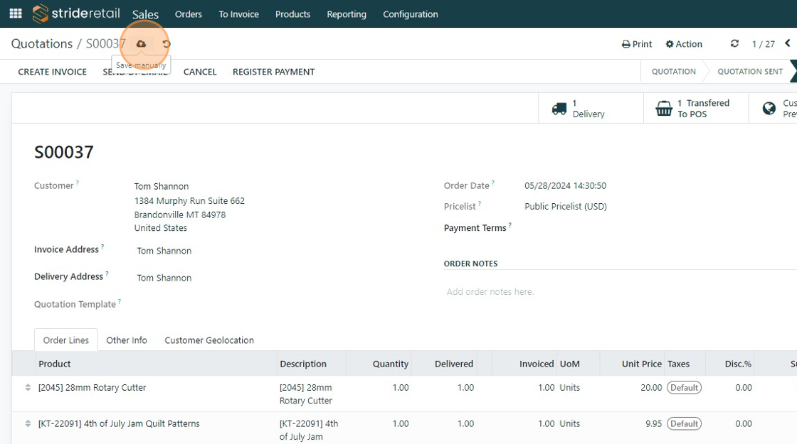 19. The second order was one that had a service product. "Tom Shannon" and it still needs to be invoiced because the POS cannot deliver service products. We will need to manually adjust the service product delivery. Click the SO.