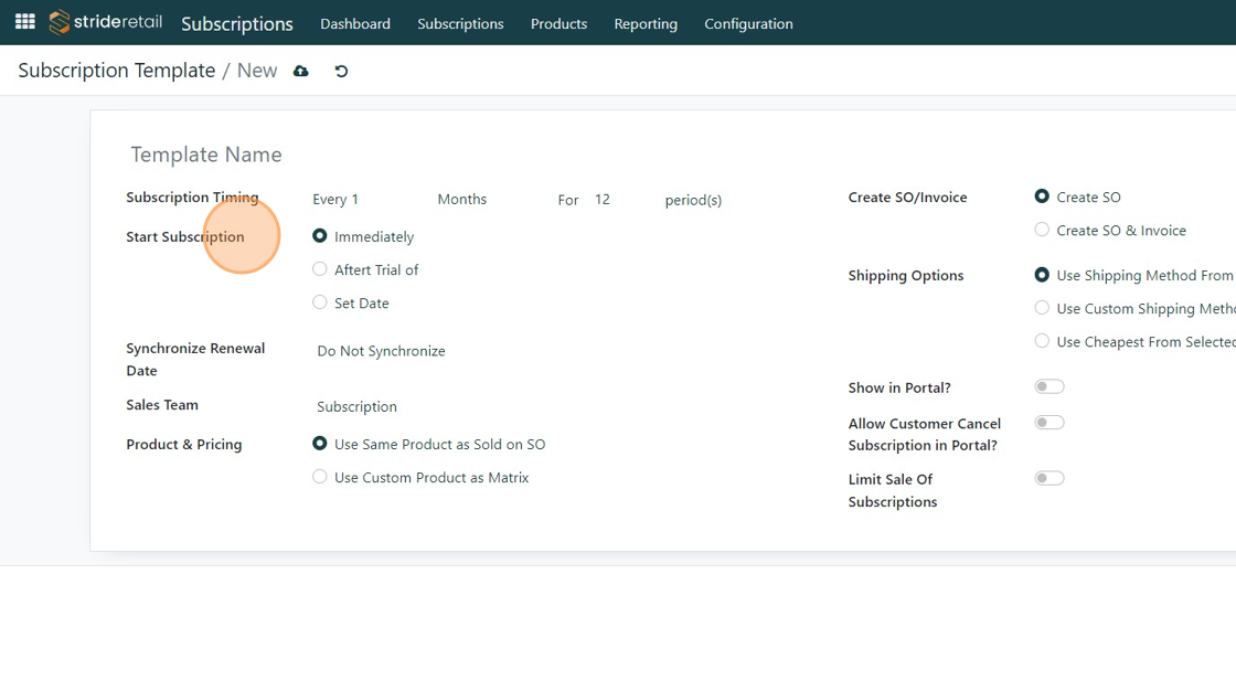 Immediately: This will trigger the subscription to start automatically and create a sales order and delivery order (if shipping a deliverable product) immediately. This will also cause the first subscription period to be invoiced and billed as well. For example, you set the subscription to "Immediately" and you have a registration fee of $1.00 and the first in the subscription is Widget 1, the customer would be charged $1.00 and the subscription would immediately start. They would then be charged for Widget 1 and a shipping order would be created (if the product was shipping). Please note that this is not a common use case. Also note, if you use the subscription start on "Set Date" feature and the date has passed, it will default to "Immediately".